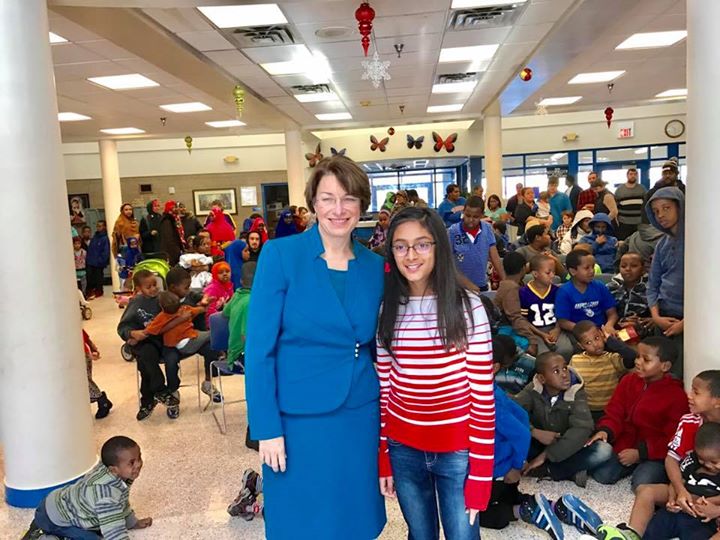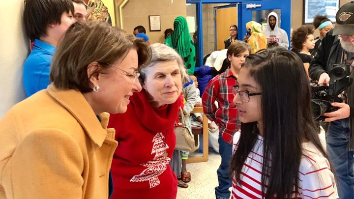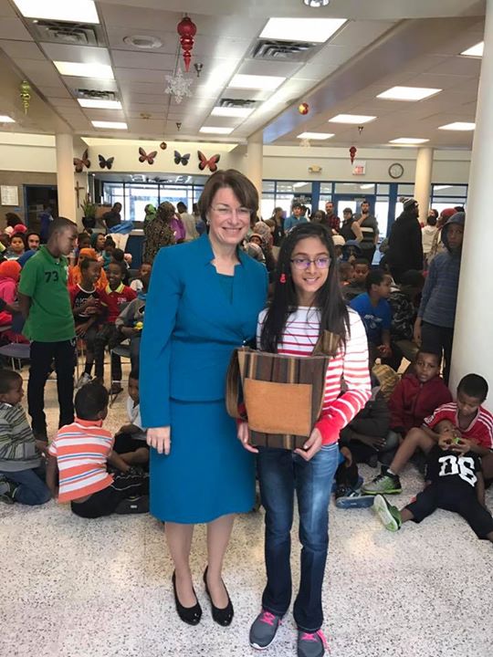 Senator Amy Klobuchar and Sanya having conversation about community need at large and her Christmas bag project at Sharing and Caring hands (homeless shelters in Minneapolis).
